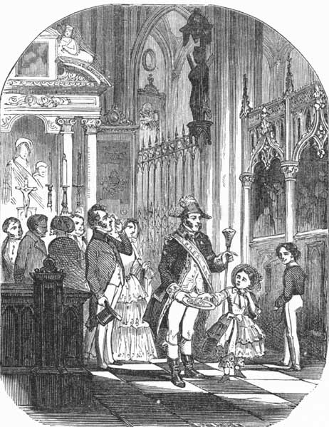 [5] These chapels are recesses or alcoves along the side of the church, fitted up and furnished with altars, crucifixes, confessionals, paintings, images, and other sacred emblems connected with the ritual of the Catholic worship. They are usually raised a step or two above the floor of the church, and are separated from it by an ornamented railing, with a gate in the middle of it.