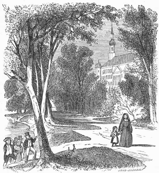 The truth of the case was, that the supposed leaning spire, which Rollo saw, was in reality a monstrous crane that was mounted on one of the towers of the celebrated unfinished cathedral at Cologne. This cathedral was commenced about six hundred years ago, and was meant to be the grandest edifice of the kind in the world. They laid out the plan of it five hundred feet long, and[Pg 22] two hundred and fifty feet wide, and designed to carry up the towers and spires five hundred feet high. You can see now how long this church was to be by going out into the road, or to any other smooth and level place, and there measuring off two hundred and fifty paces by walking. The pace—that is, the long step—of a boy of ten or twelve years old is probably about two feet. That of a full grown man is reckoned at three feet. So that by walking off, by long steps, till you have counted two hundred and fifty of them, you can see how long this church was to be; and then by turning a corner and measuring one hundred and twenty-five paces in a line at right angles to the first, you will see how wide it was to be. To walk entirely round such an area as this would be nearly a third of a mile.