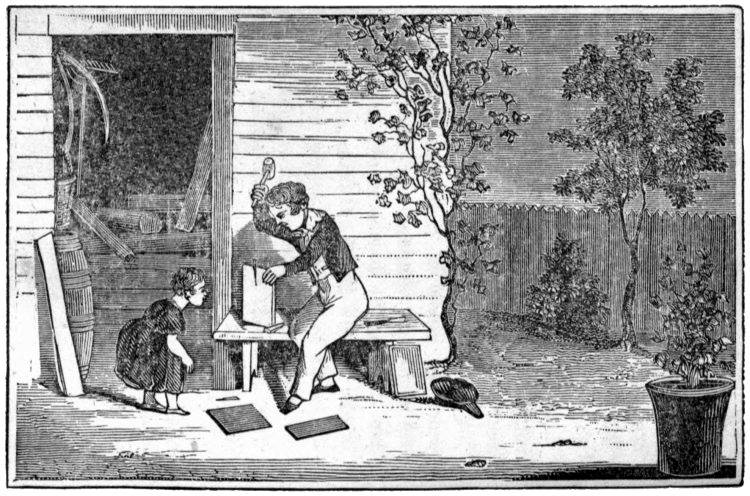 One afternoon, Rollo saw his father coming out into the garden, with a little saw and a knife, and a small pot of paint in his hands.