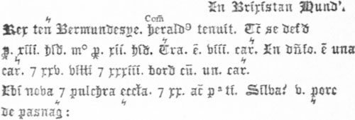 The king holds Bermundesye. Earl Herald held it [before]. At that time it was rated at thirteen hides; now, at twelve. The arable land is eight carrucates [or plow-lands]. There is one carrucate in demesne, and twenty-five villans, and thirty-three bordars, with one carrucate. There is a new and handsome church, with twenty acres of meadow, and woodland for five hogs in pasnage [pasturage] time.