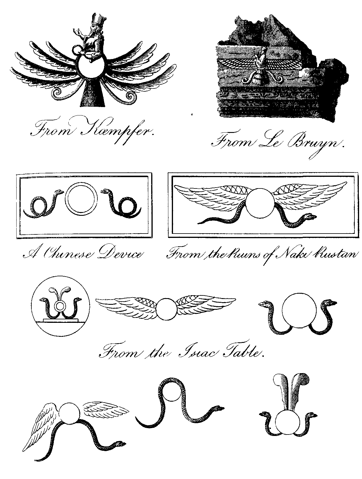 Canuphis was sometimes expressed Anuphis and Anubis; and, however rendered, was by the Greeks and Romans continually spoken of as a dog; at least they supposed him to have had a dog's head, and often mention his [43]barking. But they were misled by the title, which they did not understand. The Egyptians had many emblematical personages, set off with heads of various animals, to represent particular virtues and affections, as well as to denote the various attributes of their Gods. Among others was this canine figure, which I have no reason to think was appropriated to Canuph, or Cneph. And though upon gems and marbles his name may be sometimes found annexed to this character, yet it must be looked upon as a Grecian work, and so denominated in consequence of their mistaken notion. For we must make a material distinction between the hieroglyphics of old, when Egypt was under her own kings; and those of later date, when that country was under the government of the Greeks: at which time their learning was greatly impaired, and their antient theology ruined. Horus Apollo assures us, if any credit may be given to what he says, that this canine figure was an emblem of the earth: [44]Οικουμενην γραφοντες κυνοκεφαλον ζωγραφουσι. When they would describe the earth, they paint a Cunocephalus. It could not, therefore, I should think, in any degree relate to Canuphis. The same[45] writer informs us, that under the figure of a dog they represented a priest, or sacred scribe, and a prophet; and all such as had the chief management of funerals: also the spleen, the smell, sneezing; rule and government, and a magistrate, or judge: which is a circumstance hardly to be believed. For, as hieroglyphics were designed to distinguish, it is scarce credible that the Egyptians should crowd together so many different and opposite ideas under one character, whence nothing could well ensue but doubt and confusion. Besides, I do not remember, that in any group of antient hieroglyphics the figure of a dog occurs. The meaning of this history, I think, may be with a little attention made out. The Egyptians were refined in their superstitions, above all the nations in the world; and conferred the names and titles of their Deities upon vegetables and animals of every species; and not only upon these, but also upon the parts of the human body, and the very passions of the mind. Whatever they deemed salutary, or of great value, they distinguished by the title of Sacred, and consecrated it to some [46]God. This will appear from words borrowed from Egypt. The Laurel, Laurus, was denominated from Al-Orus: the berry was termed bacca, from Bacchus; Myrrh, Μυῤῥα was from Ham-Ourah; Casia, from Chus. The Crocodile was called Caimin and Campsa; the Lion, El-Eon; the Wolf, El-Uc; the Cat, Al-Ourah: whence the Greeks formed λεων, λυκος, αιλουρος. The Egyptians styled Myrrh, Baal; balsam, baal-samen; Camphire, Cham-phour, καμφουρα of Greece; Opium, Ophion. The sweet reed of Egypt was named [47]Canah, and Conah, by way of eminence; also, [48]Can-Osiris. Cinnamon was denominated from Chan-Amon; Cinnabar, κινναβαρις, from Chan-Abor; the sacred beetle, Cantharus, from Chan-Athur. The harp was styled Cinnor, and was supposed to have been found out by Cinaras; which terms are compounded of Chan-Or, and Chan-Arez; and relate to the Sun, or Apollo, the supposed inventor of the lyre. Priests and magistrates were particularly honoured with the additional title of Cahen; and many things held sacred were liable to have it in their composition. Hence arose the error of Horus Apollo; who, having been informed that the antient Egyptians distinguished many things which were esteemed holy by this sacred title, referred the whole to hieroglyphics, and gave out that they were all represented under the figure of a dog. And it is possible, that in later times the Grecian artists, and the mixed tribes of Egypt, may have expressed them in this manner; for they were led by the ear; and did not inquire into the latent purport of the [49]theology transmitted to them. From hence we may perceive how little, in later times, even the native Egyptians knew of their rites and history.