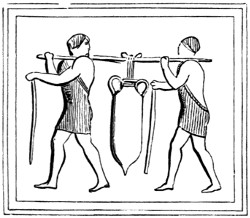 With the ancient Egyptians it was much the same. As a rule, no picture or description affixed to the shop announced the trade of the owner; the goods exposed for sale were thought sufficient to attract attention. Occasionally, however, there were inscriptions denoting the trade, with the emblem which indicated it;[1] whence we may assume that this ancient nation was the first to appreciate the benefit that might be derived from signboards.