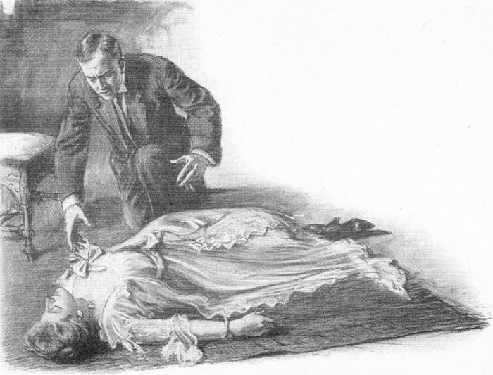A shuffling step sounded in the hallway just outside. Mr. Grimm stepped back from the kneeling figure, and turned to face the door with his revolver ready.