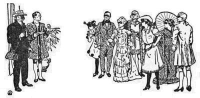 A Watteau Shepherdess was assisted out of an automobile by Christopher Columbus and they came up the walk arm-in-arm, while a Pierrette ran beside them laughing up into their faces. D'Artagnan, Athos, Aramis, and Porthos swaggered along with insolent, clanking swords.