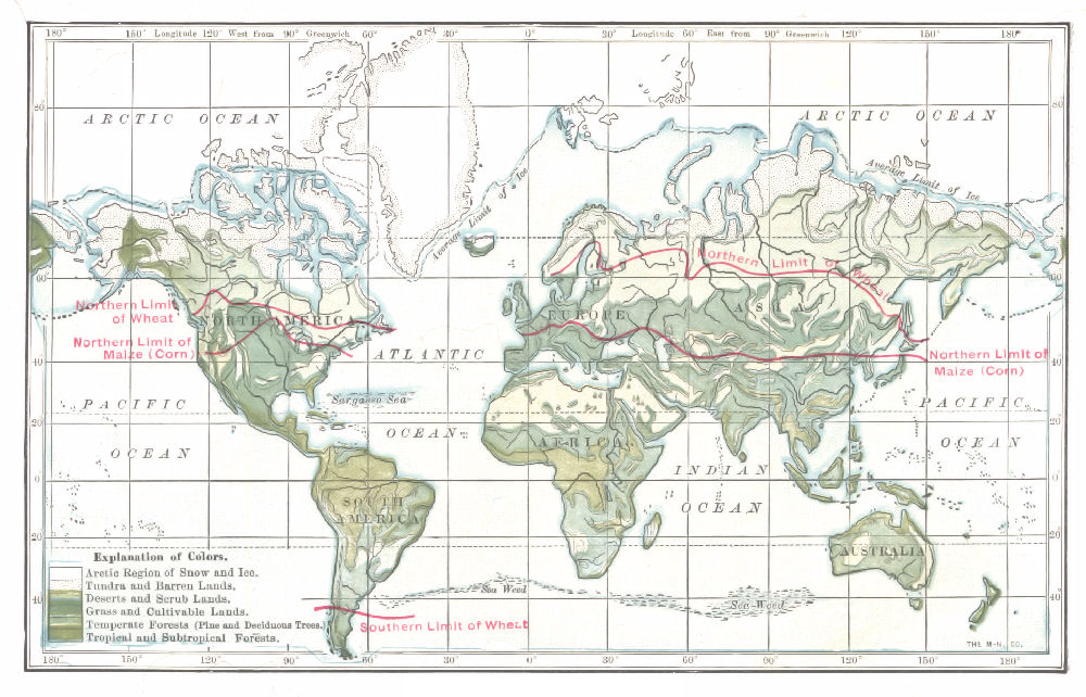 There is scarcely a country in the world that does not yield something or other to civilized peoples. There is scarcely a household whose furnishings and contents do not represent an aggregate journey of several times around the earth. A family in New York at breakfast occupy chairs from Grand Rapids, Mich.; they partake of bread made of wheat from Minnesota, and meat from Texas prepared in a range made in St. Louis; coffee grown in Sumatra or Java, or tea from China is served in cups made in Japan, sweetened with sugar from Cuba, stirred with spoons of silver from Nevada. Spices from Africa, South America, and Asia season the food, which is served on a table of New Hampshire oak, covered with[Pg 2] a linen spread made from flax grown in Ireland or in Russia. Rugs from Bokhara, or from Baluchistan, cover the floors; portières made in Constantinople hang at the doors; and the room is heated with coal from Pennsylvania that burns in a furnace made in Rhode Island.