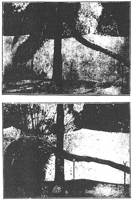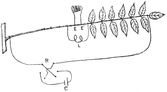 In Mimosa excitation is followed by the striking manifestation of the fall of the leaf. But in rigid trees contraction under excitation cannot find expression in movements. I have shown elsewhere that even in the absence of realised movement, the state of excitation can be detected by the induced electromotive change. I have shown that not only every plant but every organ of every plant is sensitive and reacts to stimulus by electric response of galvanometric negativity.[X]