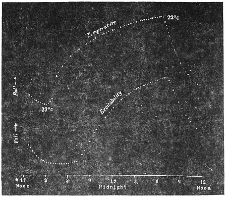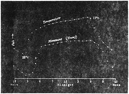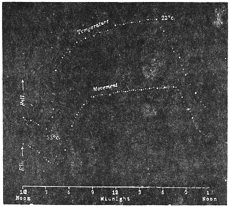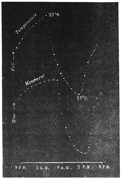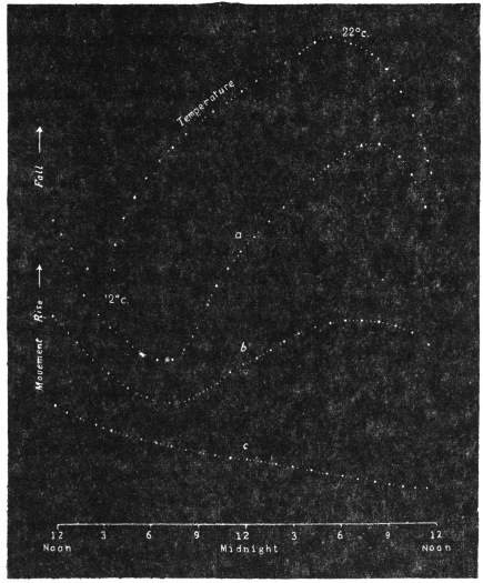 Description of phenomenon—The Recording apparatus—Record of diurnal movement of the tree—Universality of tree movement—Cause of periodic movement—Periodic movement of trees, and diurnal variation of moto-excitability in Mimosa pudica—Relative effects of light and temperature—Physiological character of the movement—Transpiration and diurnal movement—Diurnal movement in inverted position—Effect of variation of temperature on geotropic curvature—Reversal of natural rhythm by artificial variation of temperature5