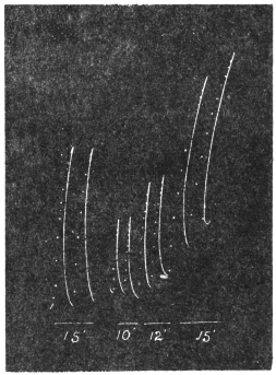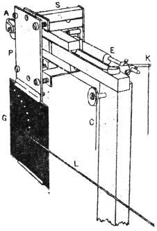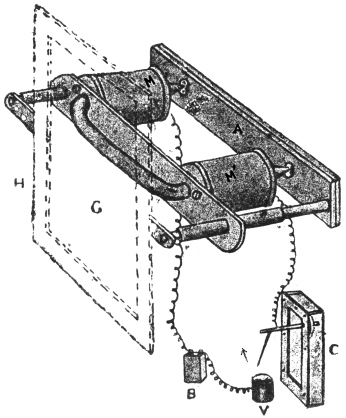 The clockwork is governed by a revolving fan which can be gradually opened out by a regulating screw. The speed can thus be adjusted within wide limits, and maintained constant and at any desired speed. A second set of wheels connected with the clockwork moves the plate-holder in a lateral direction. A series of records may thus be taken for fifteen minutes, half an hour, or an hour.