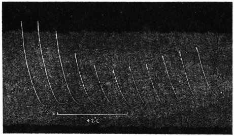 Effect of rise of temperature on pulse-record: Experiment 93.—In studying the effect of rise of temperature on the pulsation of leaflets of Desmodium, we discover similar antagonistic reactions of light and warmth. The leaflet was placed in a plant-chamber with an electric arrangement for gradual rise of temperature. The first two records were taken in the normal temperature of the room, which was 30°C. The temperature was gradually raised to 35°C, the record being taken all the time. It will be seen (Fig. 87) that the effect of warmth is diametrically opposite to that of light. The record in Fig. 86 exhibited the contractile effect of light by reducing the diastolic limit of expansion. In the present case the expansive reaction of warmth is exhibited by the reduction of systolic limit of contraction. The temperature of the plant chamber was now allowed to return to 30°C., and we observe the gradual restoration of normal systolic limit of contraction.