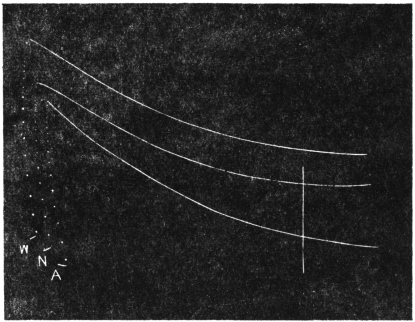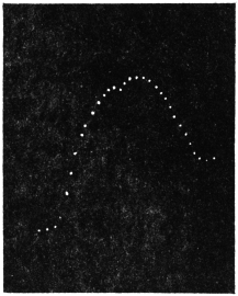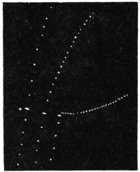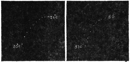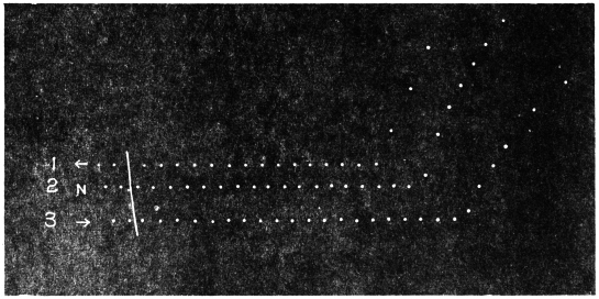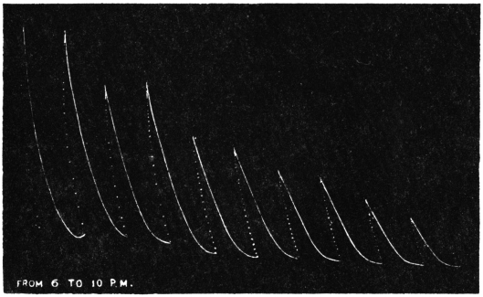 Experiment 92.—For the study of effect of light on Desmodium, I first obtained record in darkness. A horizontal beam of divergent light from an arc lamp placed at a distance of 200 cm. was made to act diffusely on the leaf from all sides. This was done by means of three inclined mirrors, the first throwing the light vertically downwards, the second vertically upwards, and the third horizontally forward from the side opposite the lantern. The effect of light is seen demonstrated in Fig. 86.
