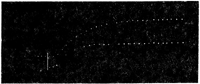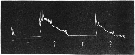 Inspection of the record exhibits another very interesting characteristic. We saw that light retarded growth by inducing an incipient contraction. In the Desmodium leaflet the contractile reaction of light is exhibited by the characteristic modification of its pulsations. The duration of application of light is represented by the horizontal line. In Fig. 86 the up-curve represents up-movement of diastolic expansion, and the down-curve of systolic contraction. The contractile reaction of light is seen to counteract the normal expansion, with diminution of diastolic limit of pulsation.