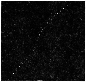 Action of white light: Experiment 95.—The source of light was an arc lamp; a pencil of parallel light is made to pass through a trough of alum solution. This process of excluding thermal rays is adopted for the visible rays of the spectrum. Colour filters were also used for obtaining red, yellow and blue lights. The pencil of light is thrown upwards by an inclined mirror on the lower half of the pulvinus. The response is taken by an Oscillating recorder, giving successive dots at intervals of 10 seconds, the magnification employed being 100 times. The pulvinus being subjected to light for 10 seconds gave response by a fall of the leaf (Fig. 89). The response to light is thus found to be essentially similar to that induced by electric stimulus, the only difference being in the relative sluggishness of the reply. Electric shock passes instantaneously through the mass of the pulvinus, stirring up the active tissues to responsive contraction. The latent period is, therefore, as short as 0.1 second and the maximum contraction is effected in about 3 seconds. In the case of the stimulus of light the shock-effect is not so great; excitation, moreover, has to pass slowly from the surface of the pulvinus inwards. Hence the latent period is twelve seconds, and the period of maximum contraction is as long as 90 seconds. As the stimulation is moderate, the recovery is effected in 11 minutes, instead of 16 minutes, which is the usual period for Mimosa to recover from an electric shock. The important conclusion to be derived from this experiment is, that light is a mode of stimulation and that it induces a responsive contraction, similar to that caused by other forms of stimuli. This contractile response under light is exhibited not merely by the motile pulvinus of Mimosa, but by other pulvini as well, such as those of Erythrina indica, and of the ordinary bean plant.