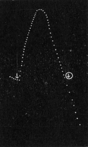 Fig. 207.—Light applied at arrow, and stopped at the second arrow within a circle. After-effect of pre-maximum stimulation is continuation of positive curvature followed by recovery.