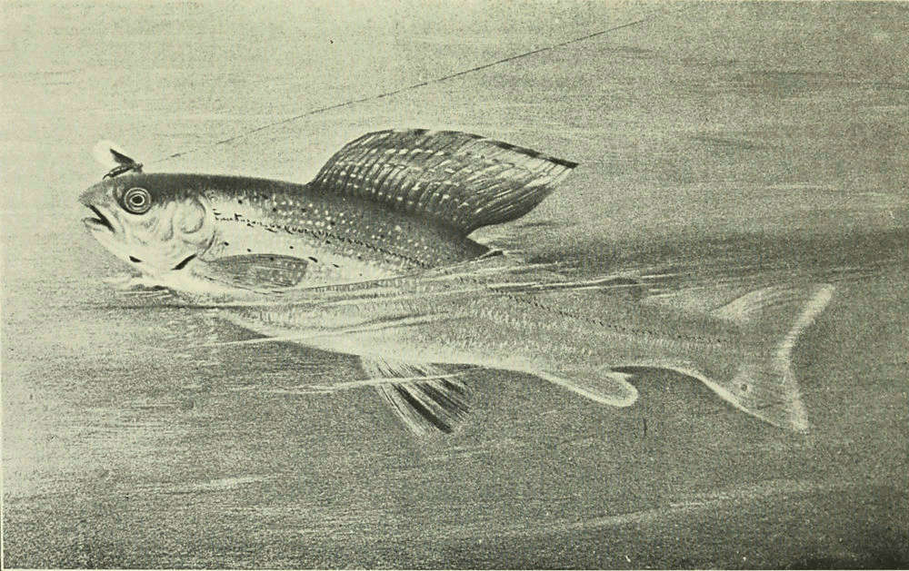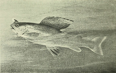 A tarpon will leap six feet high, but the[14] cero, or Florida kingfish, will leap higher, for it is the greatest vaulter of them all. The ladyfish executes a series of short, whirling leaps that puzzle the eye to follow—it is the gamest fish for its size in salt water. The leap of the flying-fish is sustained for a long distance by its wing-like pectoral fins, on the principle of the aëroplane, though its sole motive power is probably derived from its tail before leaving the water. The salt-water mullet is an expert jumper, leaping often in play, but when pursued by an enemy its leaps are higher and longer than would be expected from its size. The brook trout, pike, and mascalonge seldom leap when hooked, though the steelhead trout and grayling both leap nearly as often as the black bass in their efforts to dislodge the hook. The leap of the salmon is a long, graceful curve, as it heads up stream. Once, while playing my first salmon, on the Restigouche, many years ago, my taut line was leading straight down the stream, when I caught sight of a salmon over my shoulder and above me,[15] leaping from the surface, which, to my surprise, proved to be my hooked fish—the line making a long detour in the swift water.