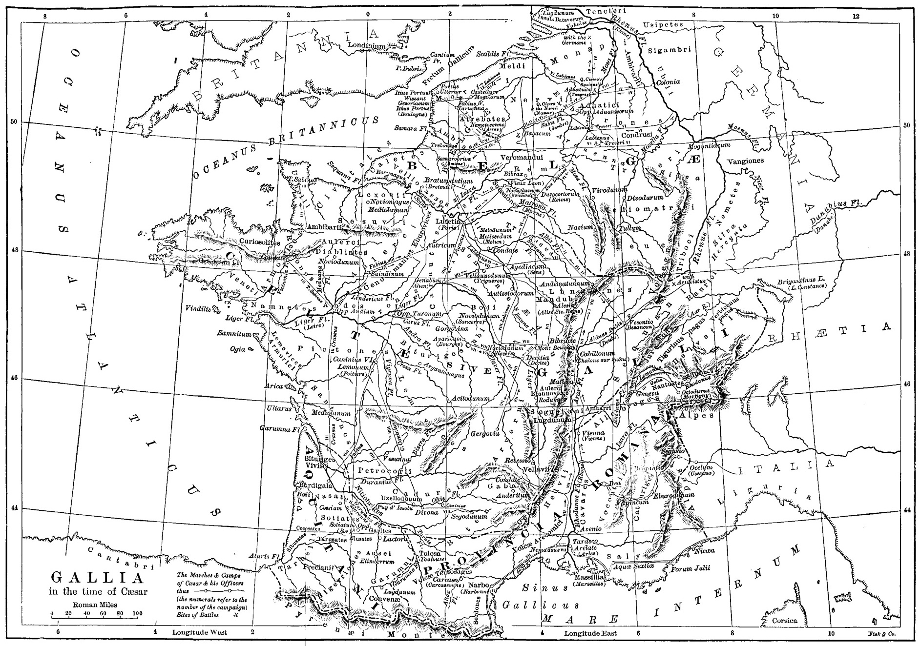 Caesar’s Military Narrative.—Divisions of Gaul.—Distribution of Population.—The Celts.—Degree of Civilization.—Tribal System.—The Druids.—The AEdui and the Sequani.—Roman and German Parties.—Intended Migration of the Helvetii.—Composition of Caesar’s Army.—He goes to Gaul.—Checks the Helvetii.—Returns to Italy for Larger Forces.—The Helvetii on the Saône.—Defeated, and sent back to Switzerland.—Invasion of Gaul by Ariovistus.—Caesar invites him to a Conference.—He refuses.— Alarm in the Roman Army.—Caesar marches against Ariovistus.—Interview between them.—Treachery of the Roman Senate.—Great Battle at Colmar.— Defeat and Annihilation of the Germans.—End of the First Campaign.—Confederacy among the Belgae.—Battle on the Aisne.—War with the Nervii.—Battle of Maubeuge.—Capture of Namur.—The Belgae conquered.— Submission of Brittany.—End of the Second Campaign.