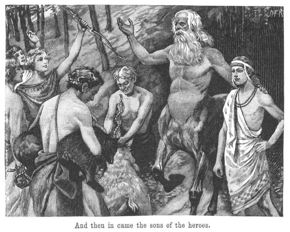 And Æson said: “I thought, Chiron will pity the lad if he sees him come alone; and I wished to try whether he was fearless, and dare venture like a hero’s son. But now I entreat you, let the boy be your guest till better times, and train him among the sons of the heroes that he may become like them, strong and brave.”