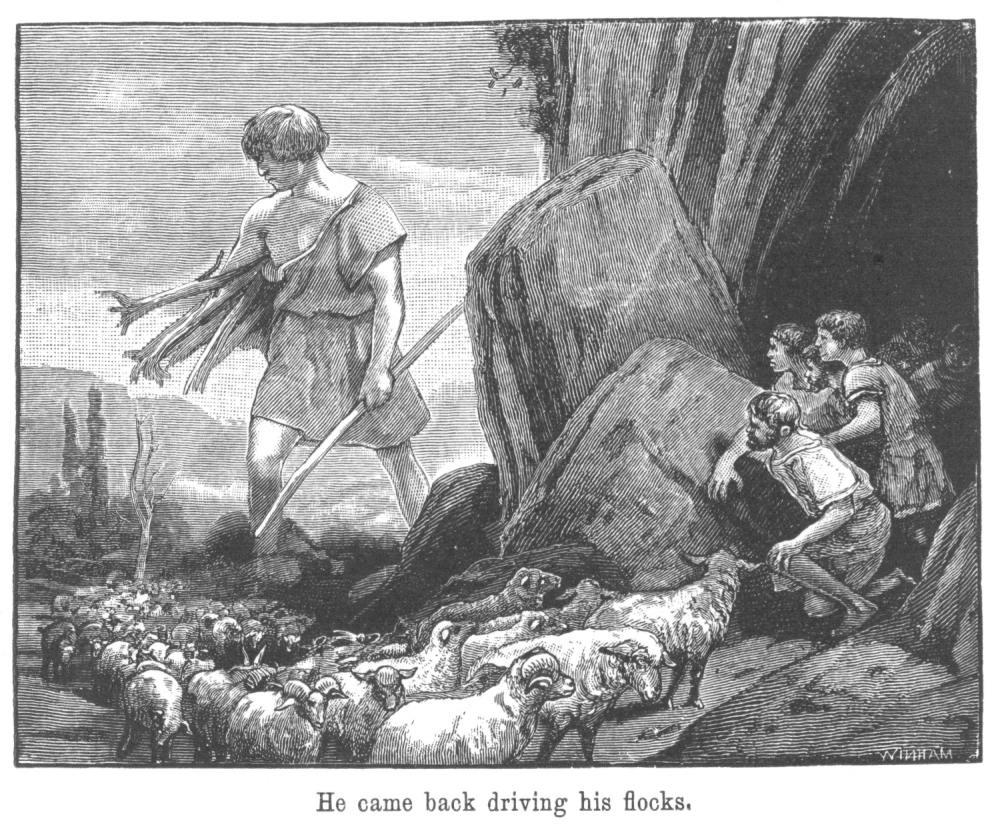 He went up and up into the mountain, over marsh and crag, and down, till the boy was tired and foot-sore, and Æson had to bear him in his arms, till he came to the mouth of a lonely cave at the foot of a mighty cliff. Above the cliff the snow wreaths hung, dripping and cracking in the sun; but at its foot, around the cave’s mouth, grew all fair flowers and herbs, as if in a garden arranged in order, each sort by itself. There they grew gayly in the sunshine, and in the spray of the torrent from above; while from the cave came a sound of music, and a man’s voice singing to the harp.