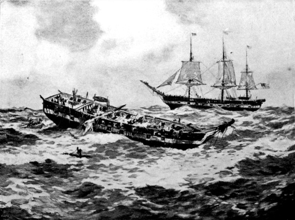 Immediately the wedges of the lower masts were loosened, and at nine o’clock orders were given to lighten ship as much as possible. The sheet-anchor was cut away and hove overboard, and all of the cable followed it. Then the spare rigging and spars were put over the side, and before ten o’clock they scuttled the wardroom-deck and hove253 overboard about fifty tons of the kentledge.