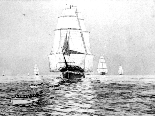 It had been very calm on the morning of the 28th when the great ship had been sighted which, as Biddle has recorded, every one took to be a large East-Indiaman. As the Peacock was in advance and to the windward of the stranger, it was feared by the crew of the Hornet that she would be first to place herself alongside and secure the rich prize. According to the private journal of one of the officers on the Hornet, they had already begun in their imagination to divide the contents of the vessel they expected to capture among them. If she came from the Indies, the sailors declared that they would carpet the berth-deck with costly rugs; while if she hailed from England and was on an outward voyage, the officers revelled in the idea of what her larder might contain; the probable value of her cargo was estimated carefully.