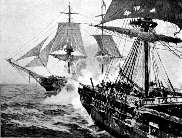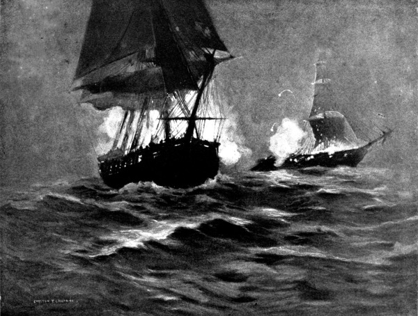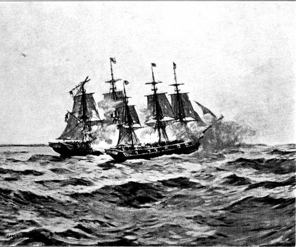 Now commenced the usual struggle for the advantage of the weather-gage; but, finding that the Constitution could outpoint them, the British vessels gave up the attempt, and, forming in line about half a cable’s length apart, awaited her on-coming, shortening sail, and evidently preparing some concerted method of attack. At six Stewart shook out his tremendous flag, and the British ensigns climbed up in answer; at the same moment both vessels gave three rousing cheers. But in grim silence the Constitution bore down upon them, ranged up on the starboard side of the sternmost, and let go her broadside at a distance of only three hundred yards. The English replied with spirit, and the cannonading became furious. There being little wind, a great bank of sulphurous smoke, impenetrable as any fog, settled over the water on the Constitution’s lee, and completely hid her antagonists. For three minutes the Constitution ceased her fire altogether (the enemy having slackened also), and then Stewart descried the topmasts of the leader stretching above the rolling clouds abreast of him. He fired his broadside, and again the smoke swallowed her from sight, just as it was seen that the ship astern had luffed to take up a raking position on the larboard quarter. The superior seamanship of the American tars and the quality of the vessel they manned could not be shown better232 than by the manoeuvre which followed. Stewart braced aback his main and mizzen topsails, and immediately the Constitution gathered sternway and slid backwards through the smoke. What must have been the astonishment of Captain Gordon Falcon, the British commander, when he saw alongside of him the enemy that he had hoped, a few minutes before, to take at such a disadvantage! The foremost vessel, that had received the previous broadside of the Constitution, kept pegging away at a spectre in the sulphurous cloud.