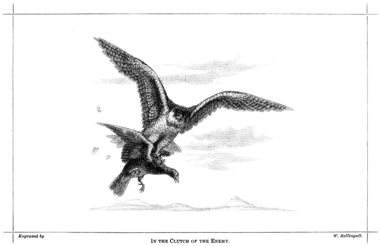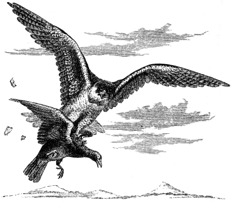 89 “The hobby falcon, which abounds in Bulgaria during the summer months, hawks large dragonflies, which it seizes with the foot and devours whilst in the air. It also kills swifts, larks, turtle-doves, and bee-birds, although more rarely.”—Falconry in the British Isles, by Francis Henry Salvin and William Brodrick. Lond. 1855.