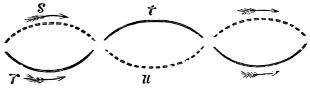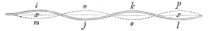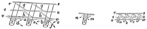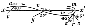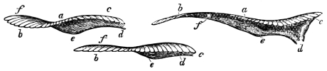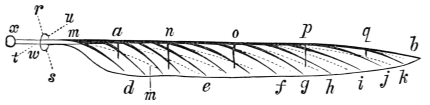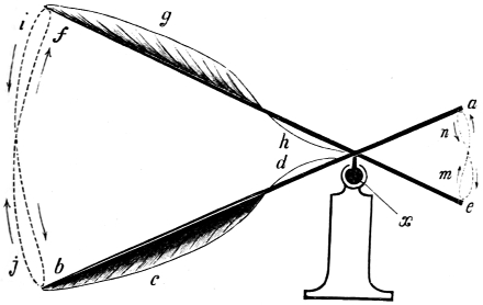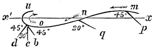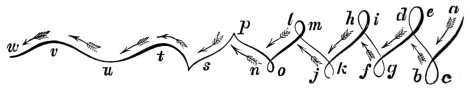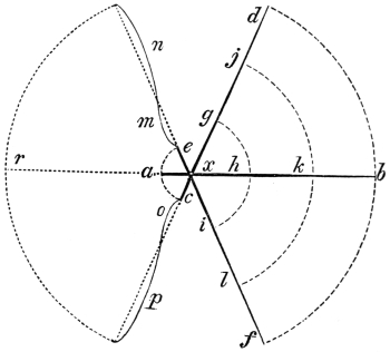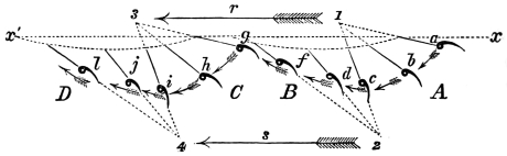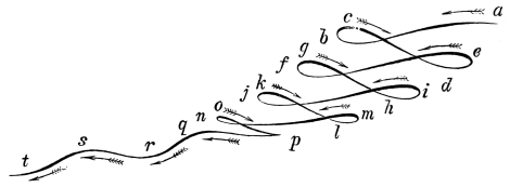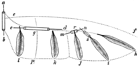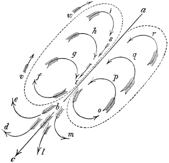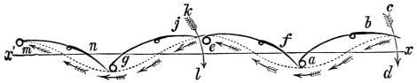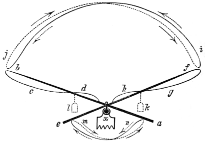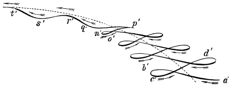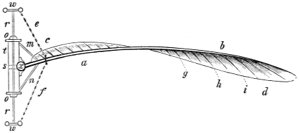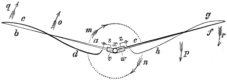 69 In this diagram I have purposely represented the right wing by a straight rigid rod. The natural wing, however, is curved, flexible, and elastic. It likewise moves in curves, the curves being most marked towards the end of the up and down strokes, as shown at m n, o p. The curves, which are double figure-of-8 curves, are obliterated towards the middle of the strokes (a r). This remark holds true of all natural wings, and of all artificial wings properly constructed. The curves and the reversal thereof are necessary to give continuity of motion to the wing during its vibrations, and what is not less important, to enable the wing alternately to seize and dismiss the air.
