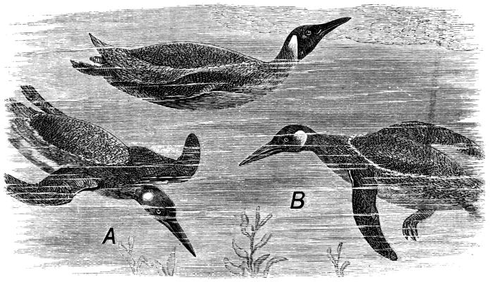 56 The guillemots in diving do not use their feet; so that they literally fly under the water. Their wings for this purpose are reduced to the smallest possible dimensions consistent with flight. The loons, on the other hand, while they employ their feet, rarely, if ever, use their wings. The subaqueous progression of the grebe resembles that of the frog.—Cuvier’s Animal Kingdom, Lond. 1840, pp. 252, 253.
