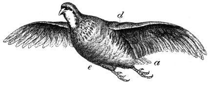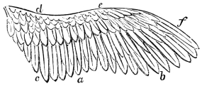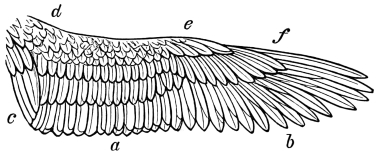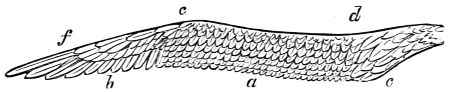 75 “The wing is short, broad, convex, and rounded in grouse, partridges, and other rasores; long, broad, straight, and pointed in most pigeons. In the peregrine falcon it is acuminate, the second quill being longest, and the first little shorter; and in the swallows this is still more the case, the first quill being the longest, the rest rapidly diminishing in length.”—Macgillivray, Hist. Brit. Birds, vol. i. p. 82. “The hawks have been classed as noble or ignoble, according to the length and sharpness of their wings; and the falcons, or long-winged hawks, are distinguished from the short-winged ones by the second feather of the wing being either the longest or equal in length to the third, and by the nature of the stoop made in pursuit of their prey.”—Falconry in the British Isles, by F. H. Salvin and W. Brodrick. Lond. 1855, p. 28.