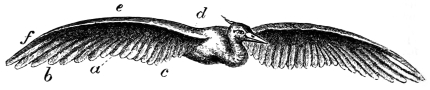 70 In birds which skim, sail, or glide, the pinion is greatly elongated or ribbon-shaped, and the weight of the body is made to operate upon the inclined planes formed by the wings, in such a manner that the bird when it has once got fairly under weigh, is in a measure self-supporting. This is especially the case when it is proceeding against a slight breeze—the wind and the inclined planes resulting from the upward inclination of the wings reacting upon each other, with this very remarkable result, that the mass of the bird moves steadily forwards in a more or less horizontal direction.