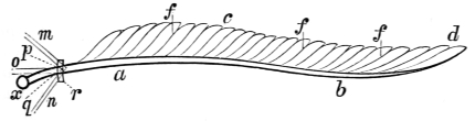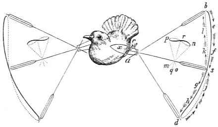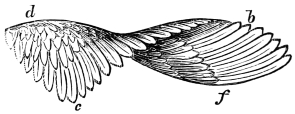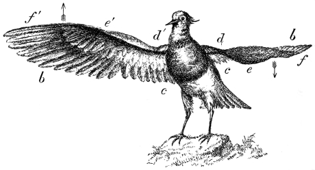 The following is the account given by M. E. Liais:—“When a bird is about to depress its wing, this is a little inclined from before backwards. When the descending movement commences, the wing does not descend parallel to itself in a direction from before backwards; but the movement is accompanied by a rotation of several degrees round the anterior edge, so that the wing becomes more in front than behind, and the descending movement is transferred more and more backwards. . . . When the wing has completely descended, it is both further back and lower than at the commencement of the movement.”—“On the Flight of Birds and Insects.” Annals of Nat. Hist. vol. xv. 3d series, p. 156.