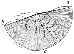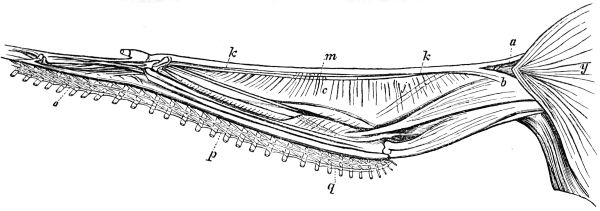 45 If the pectoral fins are to be regarded as the homologues of the anterior extremities (which they unquestionably are), it is not surprising that in them the spiral rotatory movements which are traceable in the extremities of quadrupeds, and so fully developed in the wings of bats and birds, should be clearly foreshadowed. “The muscles of the pectoral fins,” remarks Professor Owen, “though, when compared with those of the homologous members in higher vertebrates, they are very small, few, and simple, yet suffice for all the requisite movements of the fins—elevating, depressing, advancing, and again laying them prone and flat, by an oblique stroke, upon the sides of the body. The rays or digits of both pectorals and ventrals (the homologues of the posterior extremities) can be divaricated and approximated, and the intervening webs spread out or folded up.”—Op. cit. vol. i. p. 252.