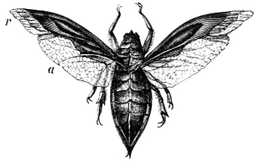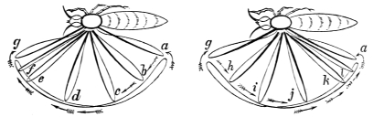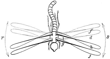 80 It happens occasionally in insects that the posterior margin of the wing is on a higher level than the anterior one towards the termination of the up stroke. In such cases the posterior margin is suddenly rotated in a downward and forward direction at the beginning of the down stroke—the downward and forward rotation securing additional elevating power for the wing. The posterior margin of the wing in bats and birds, unless they are flying downwards, never rises above the anterior one, either during the up or down stroke.