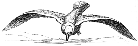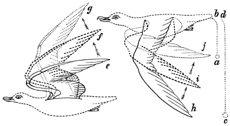 100 “If the albatross desires to turn to the right he bends his head and tail slightly upwards, at the same time raising his left side and wing, and lowering the right in proportion to the sharpness of the curve he wishes to make, the wings being kept quite rigid the whole time. To such an extent does he do this, that in sweeping round, his wings are often pointed in a direction nearly perpendicular to the sea; and this position of the wings, more or less inclined to the horizon, is seen always and only when the bird is turning.”—“On some of the Birds inhabiting the Southern Ocean.” Ibis, 2d series, vol. i. 1865, p. 227.