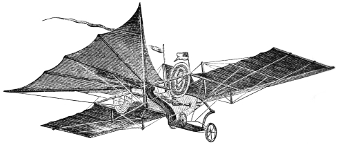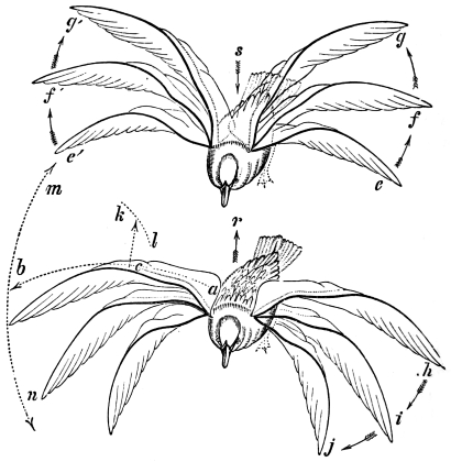 117 Compare Marey’s description with that of Borelli, a translation of which I subjoin. “Let a bird be suspended in the air with its wings expanded, and first let the under surfaces (of the wings) be struck by the air ascending perpendicularly to the horizon with such a force that the bird gliding down is prevented from falling: I say that it (the bird) will be impelled with a horizontal forward motion, because the two osseous rods of the wings are able, owing to the strength of the muscles, and because of their hardness, to resist the force of the air, and therefore to retain the same form (literally extent, expansion), but the total breadth of the fan of each wing yields to the impulse of the air when the flexible feathers are permitted to rotate around the manubria or osseous axes, and hence it is necessary that the extremities of the wings approximate each other: wherefore the wings acquire the form of a wedge whose point is directed towards the tail of the bird, but whose surfaces are compressed on either side by the ascending air in such a manner that it is driven out in the direction of its base. Since, however, the wedge formed by the wings cannot move forward unless it carry the body of the bird along with it, it is evident that it (the wedge) gives place to the air impelling it, and therefore the bird flies forward in a horizontal direction. But now let the substratum of still air be struck by the fans (feathers) of the wings with a motion perpendicular to the horizon. Since the fans and sails of the wings acquire the form of a wedge, the point of which is turned towards the tail (of the bird), and since they suffer the same force and compression from the air, whether the vibrating wings strike the undisturbed air beneath, or whether, on the other hand, the expanded wings (the osseous axes remaining rigid) receive the percussion of the ascending air; in either case the flexible feathers yield to the impulse, and hence approximate each other, and thus the bird moves in a forward direction.”—De Motu Animalium, pars prima, prop. 196, 1685.