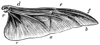 91 Mr. Macgillivray and C. J. L. Krarup, a Danish author, state that the wing is elevated by a vital force, viz. by the contraction of the pectoralis minor. This muscle, according to Krarup, acts with one-eighth the intensity of the pectoralis major (the depressor of the wing). He bases his statement upon the fact that in the pigeon the pectoralis minor or elevator of the wing weighs one-eighth of an ounce, whereas the pectoralis major or depressor of the wing weighs seven-eighths of an ounce. It ought, however, to be borne in mind that the volume of a muscle does not necessarily determine the precise influence exerted by its action; for the tendon of the muscle may be made to act upon a long lever, and, under favourable conditions, for developing its powers, while that of another muscle may be made to act upon a short lever, and, consequently, under unfavourable conditions.—On the Flight of Birds, p. 30. Copenhagen, 1869.