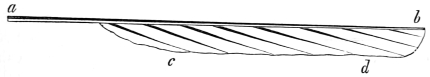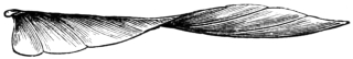 97 Advantages possessed by long Pinions.—The long narrow wings are most effective as elevators and propellers, from the fact (pointed out by Mr. Wenham) that at high speeds, with very oblique incidences, the supporting effect becomes transferred to the front edge of the pinion. It is in this way “that the effective propelling area of the two-bladed screw is tantamount to its entire circle of revolution.” A similar principle was announced by Sir George Cayley upwards of fifty years ago. “In very acute angles with the current, it appears that the centre of resistance in the sail does not coincide with the centre of its surface, but is considerably in front of it. As the obliquity of the current decreases, these centres approach, and coincide when the current becomes perpendicular to the plane; hence any heel of the machine backwards or forwards removes the centre of support behind or before the point of suspension.”—Nicholson’s Journal, vol. xxv. p. 83. When the speed attained by the bird is greatly accelerated, and the stratum of air passed over in any given time enormously increased, the support afforded by the air to the inclined planes formed by the wings is likewise augmented. This is proved by the rapid flight of skimming or sailing birds when the wings are moved at long intervals and very leisurely. The same principle supports the skater as he rushes impetuously over insecure ice, and the thin flat stone projected along the surface of still water. The velocity of the movement in either case prevents sinking by not giving the supporting particles time to separate.