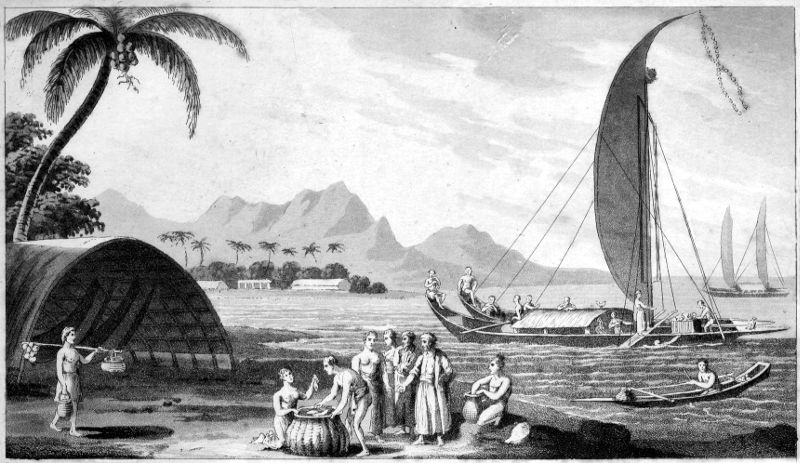 We were about four long cannon shot distant from the village or Heppah, from which four canoes were immediately dispatched, as we imagined, to reconnoitre, and, if they should find themselves able, to take us. The men were all well armed, and dressed nearly as they are represented in the figure published by Tasman; two corners of the cloth which they wrapped round the body were passed over the shoulders from behind, and being brought down to the upper edge of it before, were made fast to it just under the breast; but few, or none, had feathers in their hair.