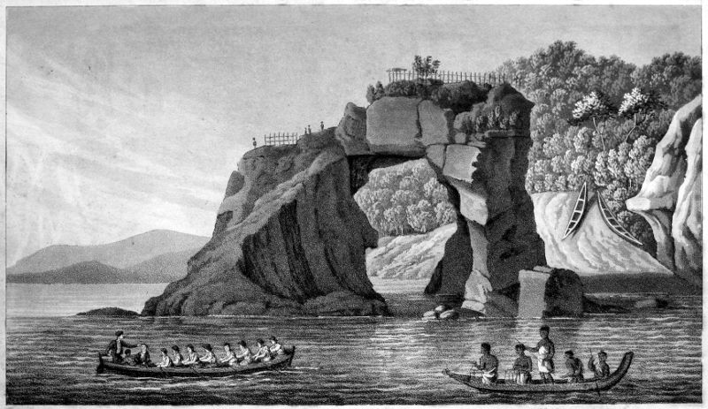 The number of inhabitants scarcely exceeds four hundred, and they live dispersed along the shores, where their food, consisting of fish and fern roots, is most easily procured; for we saw no cultivated ground. Upon any appearance of danger, they retire to their hippahs, or forts: in this situation we found them, and in this situation they continued for some time after our arrival. In comparison of the inhabitants of other parts of this country, they are poor, and their canoes are without ornament: the little traffic we had with them was wholly for fish; and indeed they had scarcely any thing else to dispose of. They seemed, however, to have some knowledge of iron, which the inhabitants of some other parts had not; for they willingly took nails for their fish, and sometimes seemed to prefer it to every thing else that we could offer, which had not always been the case. They were at first very fond of paper; but when they found that it was spoiled by being wet, they would not take it: neither did they set much value upon the cloth of Otaheite; but English broad cloth and red kersey were in high estimation; which showed that they had sense enough to appreciate the commodities which we offered by their use, which is more than could be said of some of their 394neighbours, who made a much better appearance. Their dress has been mentioned already, particularly their large round head-dresses of feathers, which were far from being unbecoming.