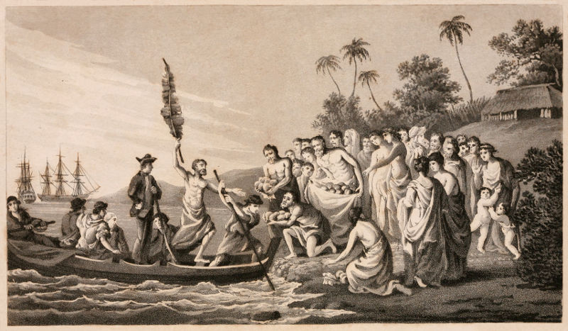 Next morning, the natives began to bring us fruit. I returned Oree’s visit, and made my present to him; one article of which was red feathers. Two or three of these the chief took in his right hand, holding them up between the finger and thumb, and said a prayer, as I understood, which was little noticed by any present. Two hogs were, soon after, put into my boat; and he, and several of his friends, came on board, and dined with us. After dinner, Oree gave me to understand what articles would be most acceptable to him and his friends; which were chiefly axes and nails. Accordingly I gave him what he asked, and desired he would distribute them to the others, which he did, seemingly to the satisfaction of every one. A youth about ten or twelve years of age, either his son or grandson, seemed to be the person of most note, and had the greatest share.