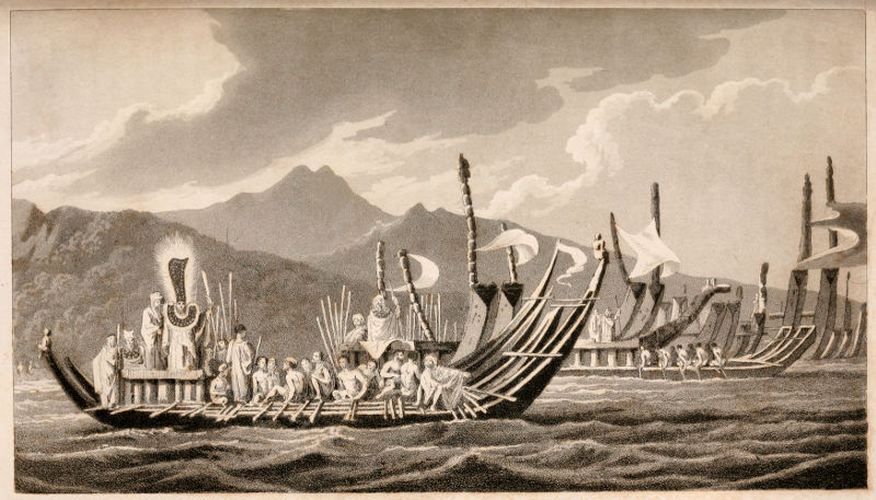 In the morning of the 26th, I went down to Oparree, accompanied by some of the officers and gentlemen, to pay Otoo a visit by appointment. As we drew near we observed a number of large canoes in motion; but were surprized, when we arrived, to see upwards of three hundred ranged in order, for some distance, along the shore, all completely equipped and manned, besides a vast number of armed men upon the shore. So unexpected an armament collected together in our neighbourhood, in the space of one night, gave rise to various conjectures. We landed however in the midst of them, and were received by a vast multitude, many of them under arms, and many not. The cry of the latter was Tiyo no Otoo, and that of the former Tiyo no Towha. This chief, we afterwards learned, was admiral or commander of the fleet and troops present. The moment we landed, I was met by a chief whose name was Tee, uncle to the king, and one of his prime ministers, of whom I inquired for Otoo. Presently after we were met by Towha, who received me with great courtesy. He took me by the one hand, and Tee by the other; 319and, without my knowing where they intended to carry me, dragged me as it were through the crowd that was divided into two parties, both of which professed themselves my friends by crying out Tiyo no Tootee. One party wanted me to go to Otoo, and the other to remain with Towha. Coming to the usual place of audience, a mat was spread for me to sit down upon, and Tee left me to go and bring the king. Towha was unwilling I should sit down, partly insisting on my going with him; but, as I knew nothing of this chief, I refused to comply. Presently Tee returned, and wanted to conduct me to the king, taking hold of my hand for that purpose. This Towha opposed; so that between the one party and the other, I was like to have been torn in pieces; and was obliged to desire Tee to desist, and to leave me to the admiral and his party, who conducted me down to the fleet. As soon as we came before the admiral’s vessel, we found two lines of armed men drawn up before her, to keep off the crowd, as I supposed, and to clear the way for me to go in. But, as I was determined not to go, I made the water, which was between me and her, an excuse. This did not answer; for a man immediately squatted himself down at my feet, offering to carry me; and then I declared I would not go. That very moment Towha quitted me, without my seeing which way he went, nor would any one inform me. Turning myself round I saw Tee, who, I believe, had never lost sight of me. Inquiring of him for the king, he told me he was gone into the country Mataou, and advised me to go to my boat; which we accordingly did, as soon as we could get collected together; for Mr. Edgcumbe was the only person that could keep with me; the others being jostled about in the crowd in the same manner we had been.