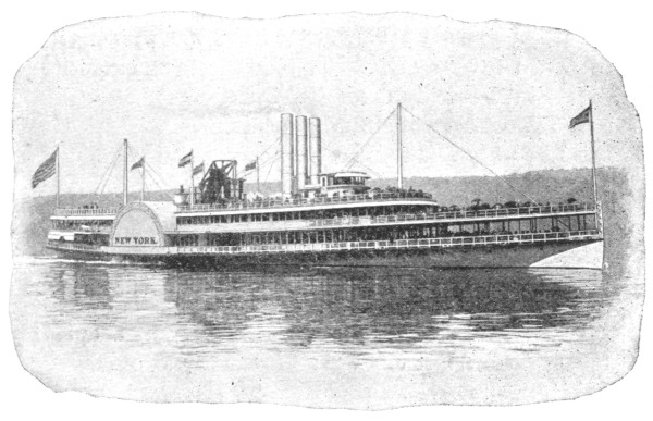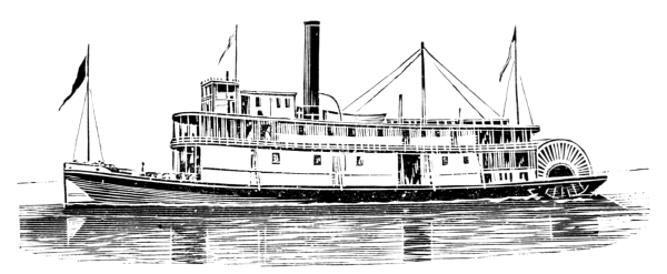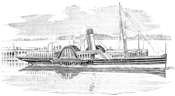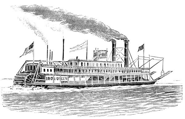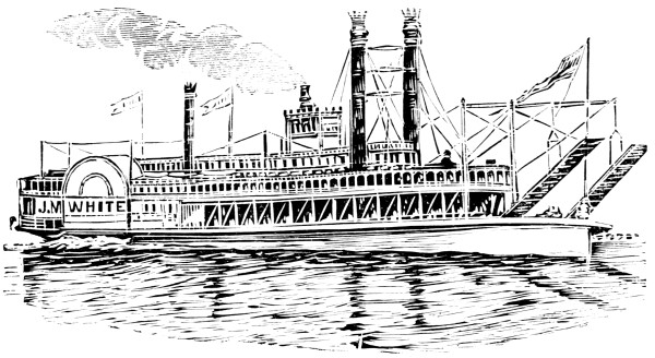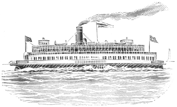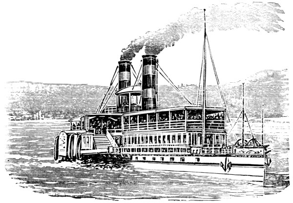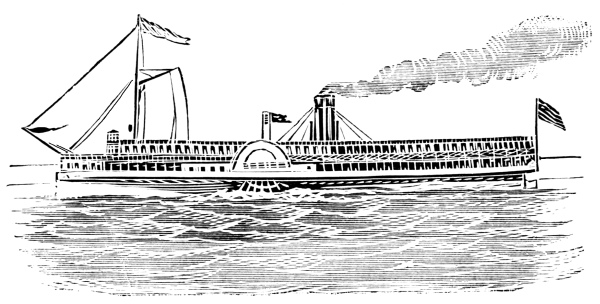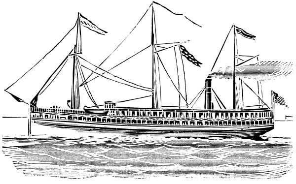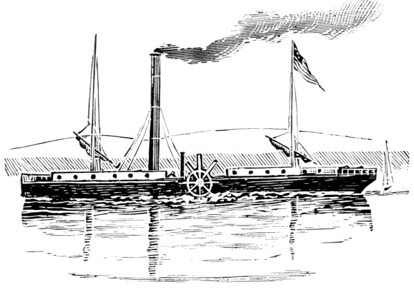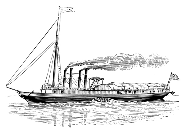 [6] These cuts, copied from Stanton’s “American Steam Vessels,” represent first class Mississippi and Ohio light-draught, high-pressure river steamers. The J. M. White, of 1878, was deemed “a crowning effort in steamboat architecture in the West.” She was 320 feet long and 91 feet in width, over the guards. Her saloons were magnificently furnished, and all her internal fittings of the most elaborate description. She carried 7,000 bales of cotton and had accommodation for 350 cabinpassengers. Her cost was $300,000. She was totally destroyed by fire in 1886.