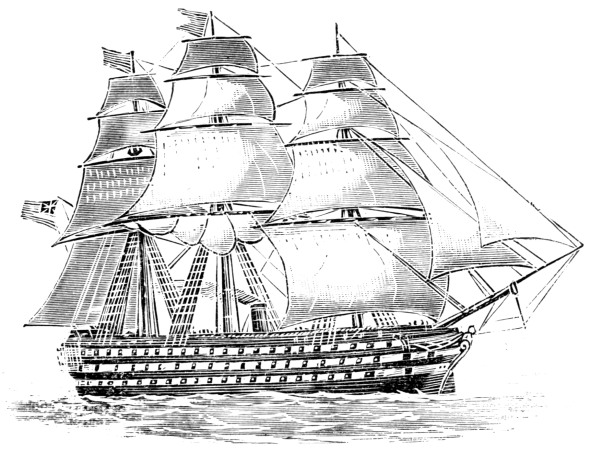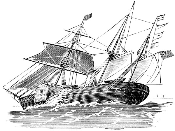 [30] The Duke of Wellington was 240.6 feet long, 60 feet beam, 3,826 tons burthen, and 2,500 horse-power. She was engined by Robert Napier & Sons, Glasgow, with geared engines and wooden cogs, and made 10.2 knots an hour on her trial trip in 1853. The Rattler, of 1851, was 179½ feet long, 32¾ feet beam, had geared engines of 436 horse-power, and attained a speed of 10 knots.