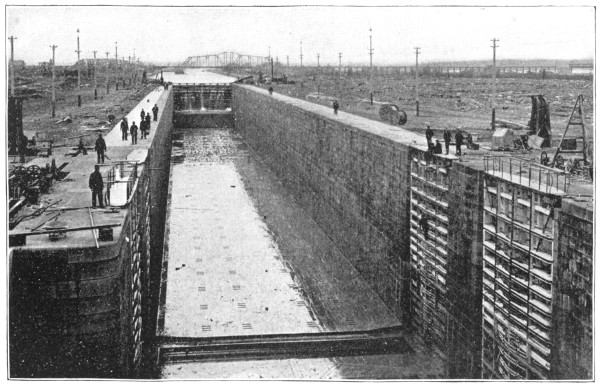 [68] The largest graving-dock in the world is said to be the one built for the Clyde Trust at Govan, on the Clyde, and recently opened. It is 880 feet long, 115 feet wide and has 26½ feet of water on the sill. The Clyde Trust are evidently looking ahead. There may be no ships of 850 feet in sight at the moment, but there is no telling how soon there will be. The Govan dock is ready for them. In the meantime it has been partitioned off into two parts by still gates, the outer division being 460 feet in length, and the inner, 420 feet.