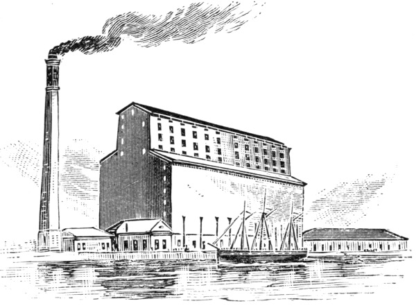 [56] The latest improvement in this direction is what is called the “Grain Sucker,” by which the process of loading and unloading cargoes of grain is accomplished with astonishing speed. The new appliance combines in its construction the main features of the ordinary elevator, and causes the grain to go through all the different movements above described, with this difference, that instead of the leg with the belt and bucket, the grain is elevated to the top of the structure on the principle of suction through a flexible pipe. The air being drawn off by pumps from the vacuum chamber, the grain is sucked up like water from a well. Machines of this kind, fitted with any number of these pipes that may be required, are used at the London docks, and are said to be capable of transferring wheat at the rate of a hundred and fifty tons an hour—Vide Strand Magazine for May, 1898.