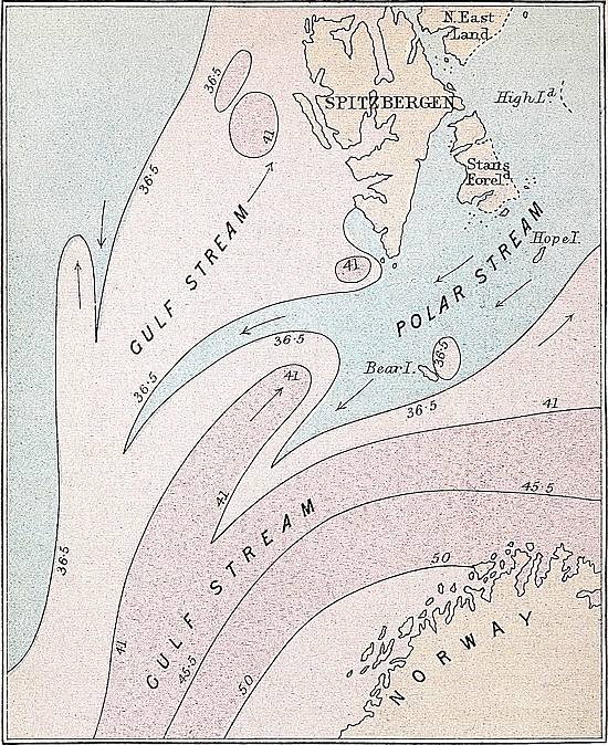 | Influence of the Gulf-stream on the Climate of the Arctic Regions.—Absolute Amount of Heat received by the Arctic Regions from the Sun.—Influence of Ocean-currents shown by another Method.—Temperature of a Globe all Water or all Land according to Professor J. D. Forbes.—An important Consideration overlooked.—Without Ocean-currents the Globe would not be habitable.—Conclusions not affected by Imperfection of Data | 45 |