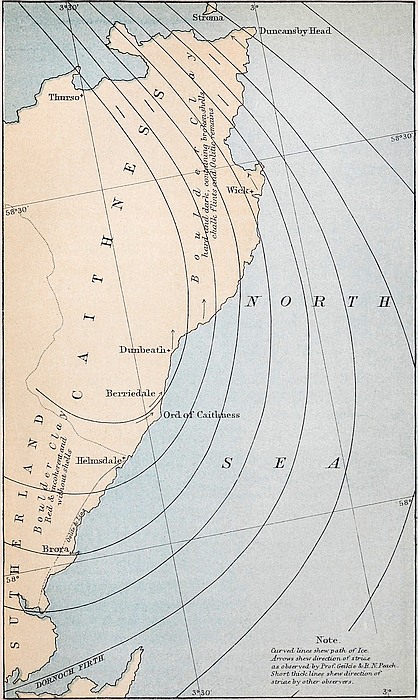 | Character of Caithness Boulder Clay.—Theories of the Origin of the Caithness Clay.—Mr. Jamieson’s Theory.—Mr. C. W. Peach’s Theory.—The proposed Theory.—Thickness of Scottish Ice-sheet.—Pentlands striated on their Summits.—Scandinavian Ice-sheet.—North Sea filled with Land-ice.—Great Baltic Glacier.—Jutland and Denmark crossed by Ice.—Sir R. Murchison’s Observations.—Orkney, Shetland, and Faroe Islands striated across.—Loess accounted for.—Professor Geikie’s Suggestion.—Professor Geikie and B. N. Peach’s Observations on East Coast of Caithness.—Evidence from Chalk Flints and Oolitic Fossils in Boulder Clay | 435 |