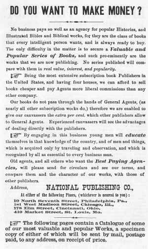 There are quite a number of these men in New York. They p. 806offer to cure all manner of diseases, some for a small and others for a large sum. It has been discovered that some of these men carry on their business under two or three different names, often thus securing a double or triple share of their wretched business. The newspapers are full of their advertisements, many of which are unfit for the columns of a reputable journal. They cover the dead walls of the city with hideous pictures of disease and suffering, and flood the country with circulars and pamphlets setting forth the horrors of certain diseases, and giving an elaborate description of the symptoms by which they may be recognized. A clever physician has said that no man ever undertakes to look for defects in his physical system without finding them. The truth of the remark is proven by the fact that a very large number of persons, reading these descriptions of symptoms, many of which symptoms are common to a number of ills, come to the conclusion that they are affected in the manner stated by the quack. Great is the power of the imagination! so great, indeed, that many sound, healthy men are thus led to fancy themselves in need of medical attention. A short interview with some reputable physician would soon undeceive them, but they lay aside their good sense, and fall victims to their credulity. They think that as the quack has shown them where their trouble lies, he must needs have the power of curing them. They send their money to the author of the circular in question, and request a quantity of his medicine for the purpose of trying it. The nostrum is received in due time, and is accompanied by a second circular, in which the patient is coolly informed that he must not expect to be cured by one bottle, box, or package, as the case may be, but that five or six, or sometimes a dozen will be necessary to complete the cure, especially if the case is as desperate and stubborn as the letter applying for the medicine seems to indicate. Many are foolish enough to take the whole half dozen bottles or packages, and in the end are no better in health than they were at first. Indeed they are fortunate if they are not seriously injured by the doses they have taken. They are disheartened in nine cases out of ten, and are, at length, really in need of good medical advice. They have paid the p. 807quack more money than a good practitioner would demand for his services, and have only been injured by their folly.