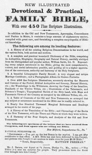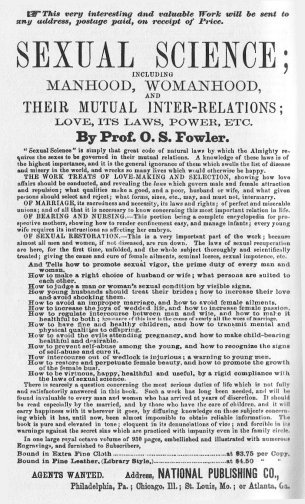 Sometimes the advertiser is “A lady who has been cured of great nervous debility after many years of misery.” Again, the advertiser is a “Retired clergyman,” or a “Sufferer restored to health, and anxious to benefit his fellow men.” In whatever form the announcement is made, the advertiser is usually one and the same person—an ignorant knave, who lives by his wits. He advertises largely in all parts of the land, spending thousands of dollars annually, and it would seem that even an idiot could understand that the most benevolent person could not afford so expensive a method of “benefiting his fellow men.” Letters come to him by the hundred, from simpletons who have “taken his bait,” asking for his valuable recipe. He sends the prescription, and notifies the party asking for it, that if the articles named in it cannot be procured by him at any drug store convenient to him, he, the “retired physician,” “clergyman,” or “nervous lady,” will furnish them, upon application, at a certain sum (generally averaging five dollars), which he assures him is very cheap, as the drugs are rare and expensive. The articles named in the prescription are utterly unknown to any druggist in the world, and the names are the production of the quack’s own brains, and, as a matter of course, the patient is unable to procure them at home, and sends an order for them with the p. 810price, to the “retired physician,” “clergyman,” or “nervous lady,” and in return receives a nostrum compounded of drugs, which any apothecary could have furnished at one half the expense. In this way the “benevolence” of the quack is very profitable. Men have grown rich in this business, and it is carried on to an amazing extent in this city. It is done in violation of the law, and the benevolent individual not unfrequently falls into the hands of the police, but, as soon as released, he opens his business under a new name. As long as there are fools and dupes in the world, so long will the “retired physician” find an extensive practice.