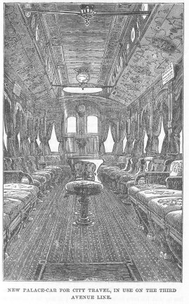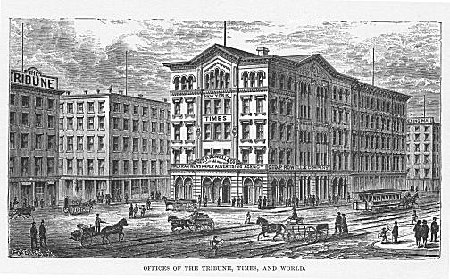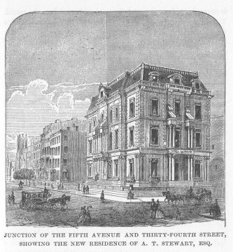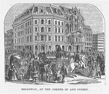 The city is substantially built. Frame houses are rare. Many of the old quarters are built of brick, but this material is now used to a limited extent only. Broadway and the principal business streets are lined with buildings of iron, marble, granite, brown, Portland, and Ohio stone, palatial in their appearance; and the sections devoted to the residences of the better classes are built up mainly with brown, Portland, and Ohio stone, and in some instances with marble. Thus the city presents an appearance of grandeur and solidity most pleasing to the eye. The public buildings will compare favorably with any in the world, and there is no city on the globe that can boast so many palatial warehouses and stores. Broadway is one of the best built thoroughfares in the world. The stores which line it are generally from five to six stories high above ground, p. 53with two cellars below the pavement, and vaults extending to near the middle of the street. The adjacent streets in many instances rival Broadway in their splendors. The stores of the city are famous for their elegance and convenience, and for the magnificence and variety of the goods displayed in them. The streets occupied by private residences are broad, clean and well-paved, and are lined with miles of dwellings inferior to none in the world in convenience and substantial elegance. The amount of wealth and taste concentrated in the dwellings of the better classes of the citizens of New York is very great.
