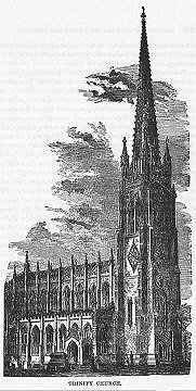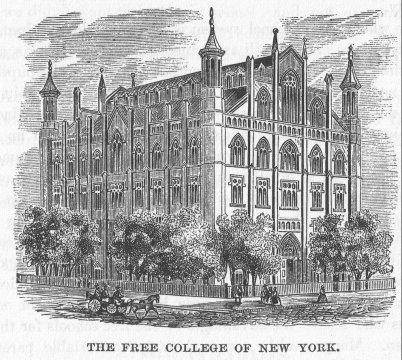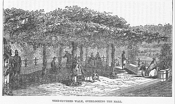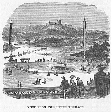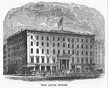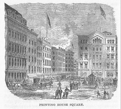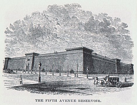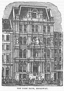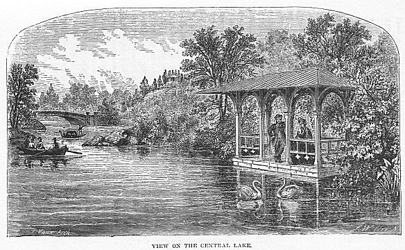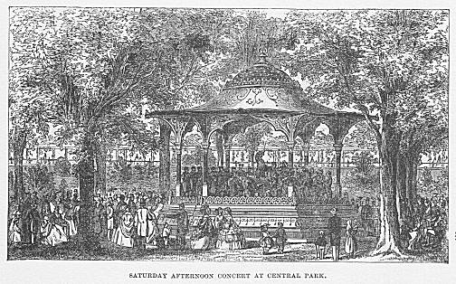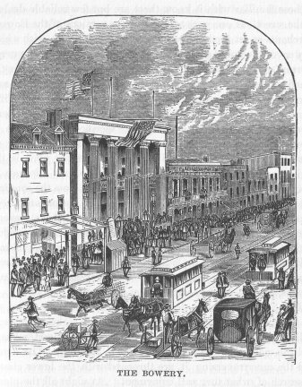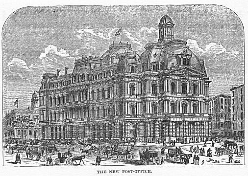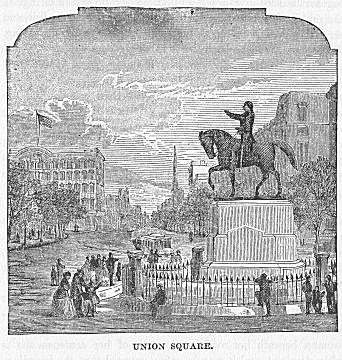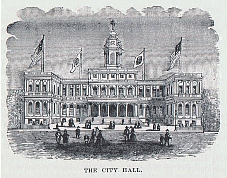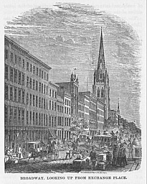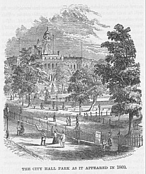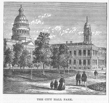 The war of 1812-15 for a while stopped the growth of the city, but after the return of peace its progress was resumed. In August, 1812, experimental gas lamps were placed in the City Hall Park, though the use of gas for purposes of lighting was not begun until 1825. In 1822 the yellow fever again drove the population up the island, and caused a rapid growth of the city above Canal street. In 1825 the Erie Canal was completed. This great work, by placing the trade of the West in the hands of New York, gave a powerful impetus to the growth of the city, which was at that time spreading at the rate of from 1000 to 1500 houses per year. In 1832 and 1834, the cholera raged severely, carrying off upwards of 4484 persons in the two years. In 1835, the “great fire” occurred. This terrible conflagration broke out on the 16th of December of that year, and swept the First Ward of the city east of Broadway and below Wall street. It laid almost the entire business quarter in ashes, destroyed 648 houses, and inflicted upon the city a loss of over $18,000,000. New York rose from this disaster with wonderful energy and rapidity, but only to meet, in 1837, the most terrible financial crisis that had ever burst upon the country. Even this did not check the growth of the city, the population increasing 110,100 between 1830 and 1840. In 1842 the Croton water was introduced. In 1849 and 1854 the p. 49cholera again appeared, killing over 5400 persons. In 1852, the first street railway was built. In 1858, the Central Park was begun.
